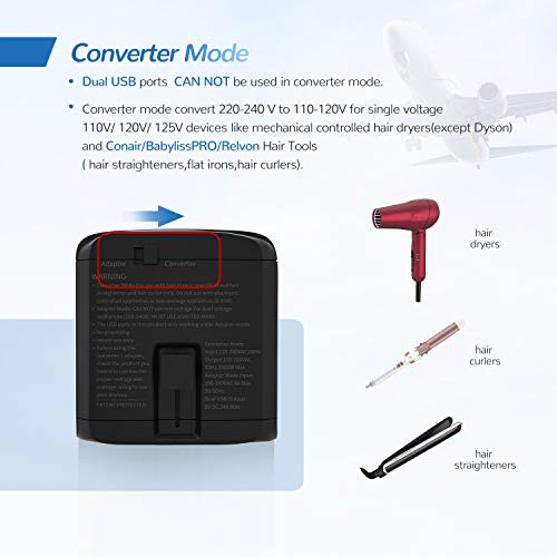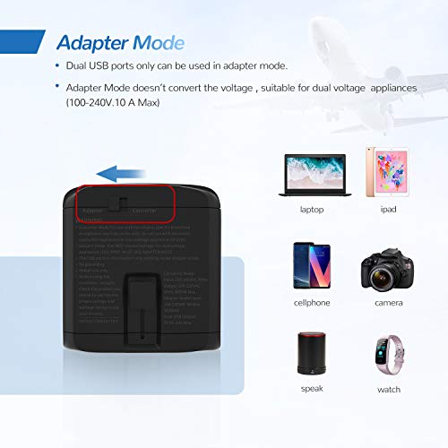 ✈✈✈【Adapter Mode with Dual USB - - Small Size But Multifunctional】 - - Adapter mode CAN NOT convert voltage, work for almost all travel DUAL VOLTAGE devices(100-240V,8 A), such as cell phone, camera, watch, ipad, laptop, macbook, dual voltage hair straightener/ curling iron/ CPAP and other dual voltage devices. NOTICE: USB ports must be used at adapter mode.