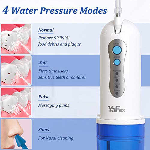 5 Different Water Jet Tips & 4 Flossing Modes: YaFex oral irrigator include 5 different interchangeable jet tips, Perfect for your oral and nasal care needs. Periodotal and Orthodontic jet are specifically designed for periodontitis, braces. Adopt latest water flosser pulse technique (pressure range of 40-120 PSI), Can powerful cleaning 99.99% food debris and plaque every corner precisely that traditional brushing can not reach.