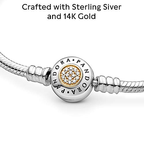 Pandora Signature, Clear CZPandora Signature Charm Bracelet: The classic Pandora charm bracelet is updated with a new spherical clasp design featuring our iconic logo and a circular field of shimmering stones. This sterling silver and lustrous 14K gold bracelet will be the perfect timeless two-tone addition to your collection and the perfect carrier for all your favorite charms.